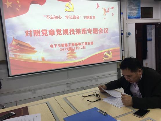 为了落实学院《关于印发<中共广西电力职业技术学院委员会关于在“不忘初心、牢记使命”主题教育中对照党章党规找差距的工作方案>的通知》精神,依据学院主题教育工作安排,11月12日电子与信息工程系教工党支部组织党员学习、对照党章党规找差距并召开专题会议。