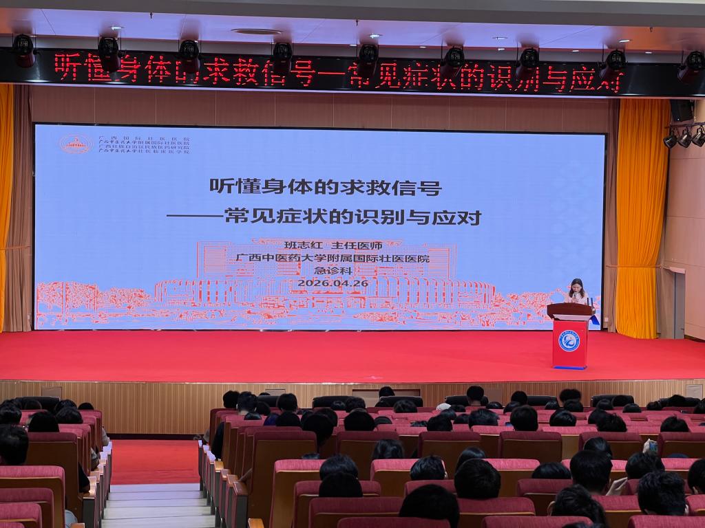 讲座邀请了广西中医药大学附属国际壮医医院急诊科班志红主任医师主讲。班志红主任结合急诊临床经验,紧扣大学生生活实际,围绕发热、胸闷、头痛、头晕、腹泻、呕吐、过敏等常见症状,系统讲解了疾病早期信号、识别方法、健康风险判断、应急处理措施及就医参考标准。