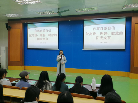 为了丰富同学们的课余生活,让广大女生更好的了解自己、关爱自己、保护自己,成长蜕变成拥有美丽、享受青春、品味生活的阳光女孩,2020年12月10日下午,我院于东校区1-106教室举办主题为“自尊 自爱 自信,做高雅、理智、聪慧的阳光女孩”的女性讲座。讲座由我院党总支蒋莉副书记主讲,全体在校女生参加。