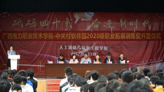 2020年11月2日,广西电力职业技术学院—中关村职业化综合训练营开营仪式在东校区礼堂举行,北京中关村智酷双创人才服务股份有限公司教研中心总监刘洋、双创产品总监朱广超、就业主管孙建全、学院党总支副书记蒋莉、副院长梁毅娟、计算机应用技术专业带头人罗锦光、移动互联应用技术专业带头人李晓华出席会议。