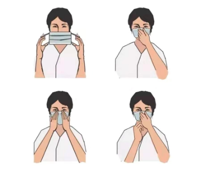 医用口罩颜色深的是正面,正面朝外,颜色浅的一面正对脸部,医用口罩上有鼻夹金属条,金属条在口罩的上方。先将手洗干净,分清楚口罩的正面、反面、上端、下端后,将两端的绳子挂在耳朵上;将口罩佩戴完毕后,用双手压紧鼻梁两侧的金属条,使口罩上端紧贴鼻梁,然后向下拉伸口罩,使口罩不留有褶皱,最好覆盖住鼻子和嘴巴。
