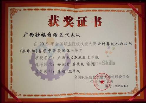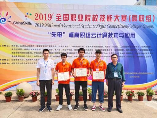 6月1日至2日,2019年全国职业院校技能大赛高职组“云计算技术与应用”赛项在安徽芜湖举行,来自全国31个省市自治区的103所高职院校的代表队同台竞技。我系甘承昊、莫秋泉、喻龙3名同学组队参赛(指导教师:李倩、庞继成),在竞赛过程中合作默契,勇于挑战,最终荣获大赛三等奖。