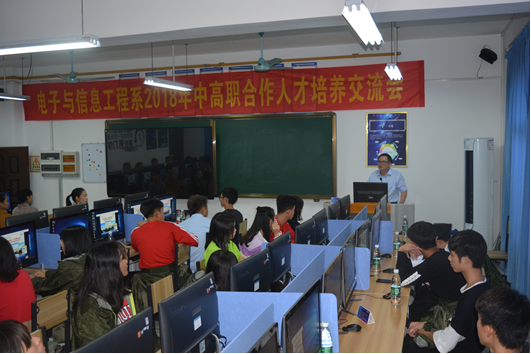 2018年11月4日下午4:00点,电子与信息工程系2018年中高职合作人才培养交流会在我院东校区电子与信息工程的百度凤巢SEM创新实训室召开。桂林机电工程学校团委副书记陈慧、学生科科员邬玲燕、学生科科员林赞文及学生一行共18人;广西工商学校学工科副科长易晓艳、团委干事周颖及学生一行共15人,赴我院参加交流会。我系主任韦抒、党总支书记钟丽娟、计算机应用技术专业带头人梁毅娟出席了会议现场。