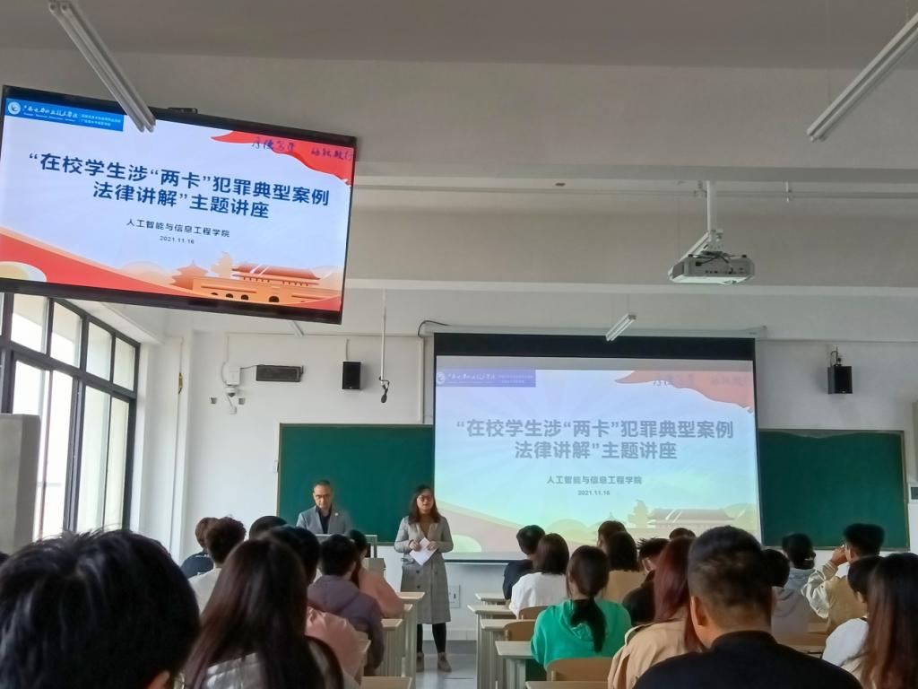为进一步提高我院师生法律意识,大力弘扬法治精神,创建和谐校园, 11月16日下午,我院在五象校区公共楼4-708教室举办“在校学生涉‘两卡’犯罪典型案例法律讲解”专题讲座。此次讲座邀请广西观复律师事务所黄鹏律师作主讲。学院党总支书记李洪丽,学院团总支书记廖艳玲,以及学院2021、2020级140余名学生出席本次讲座。
