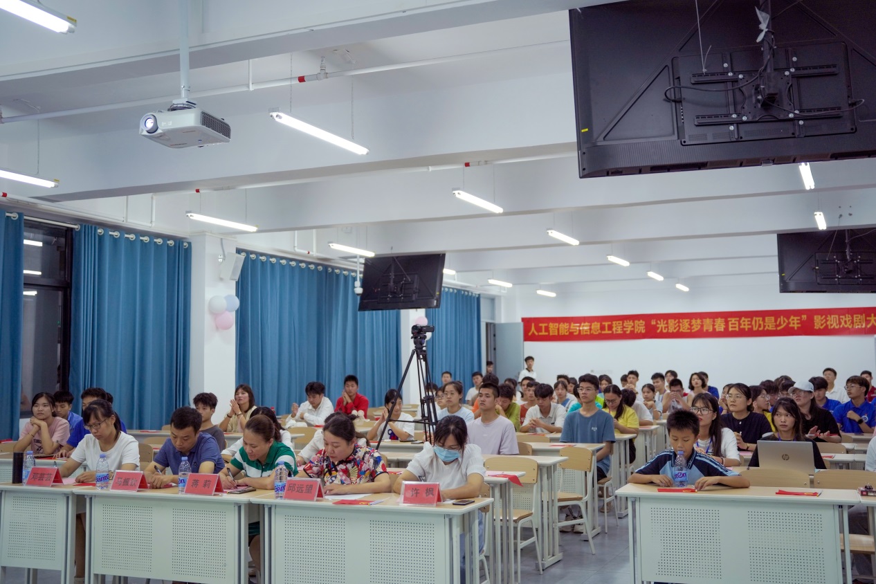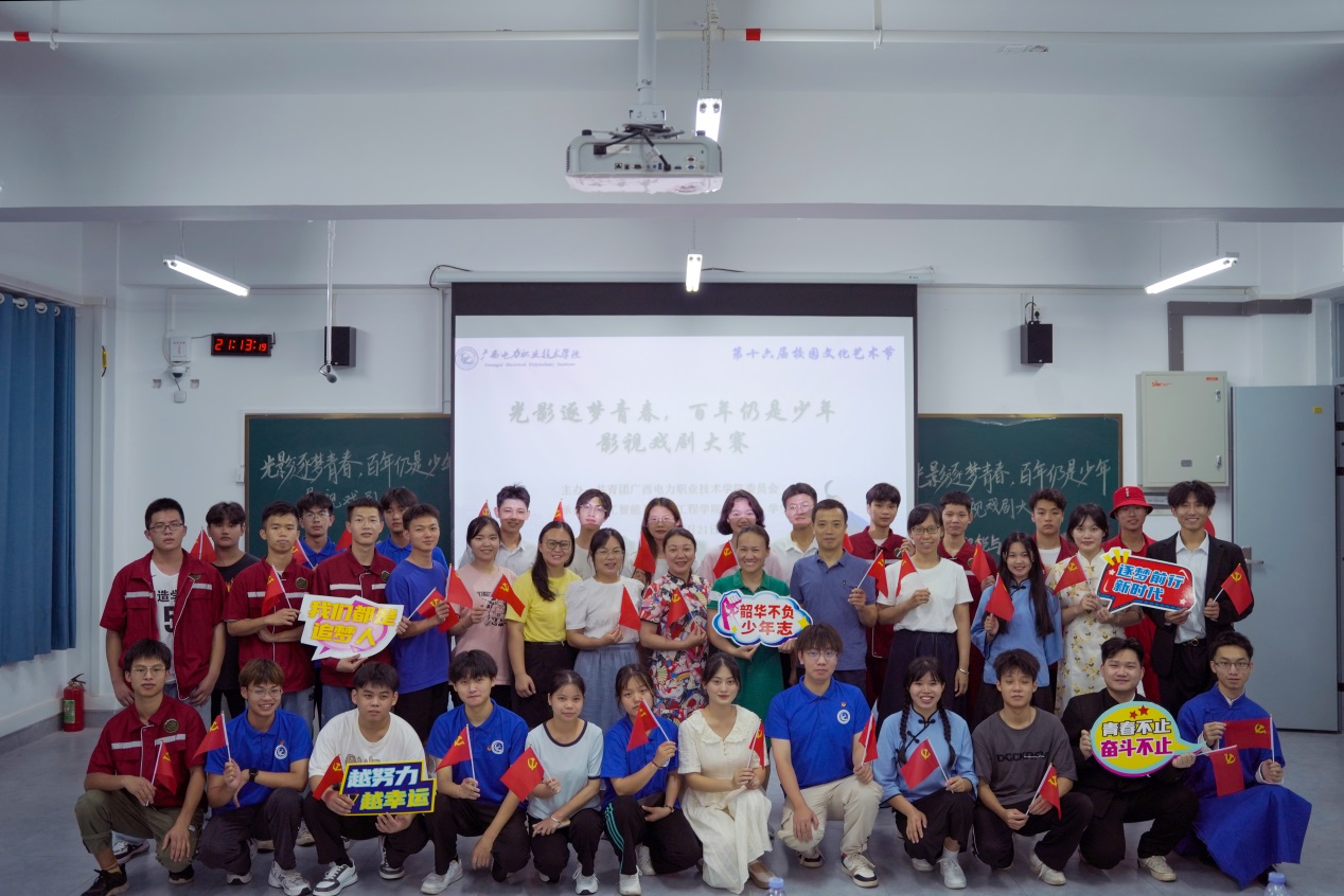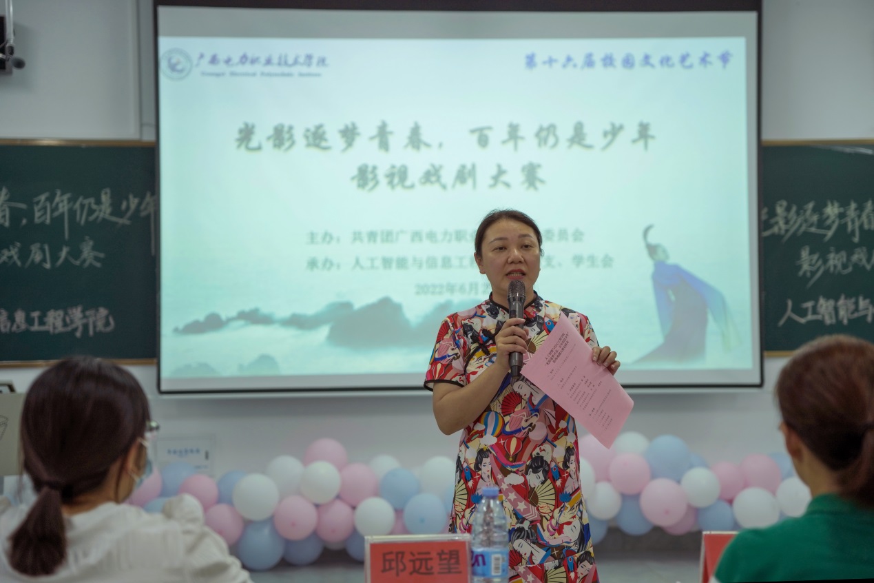 为了展现当代大学生的青春风貌与共青岁月的惺惺相惜,进一步提升团员素质,加强党性修养,喜迎二十大,永远跟党走, 2022年6月21日,我院承办学校第十六届校园文化艺术节“光影逐梦青春,百年仍是少年”影视戏剧大赛。本次大赛在五象校区公共教学楼708教室举行,各个学院大力支持,经过层层选拔,推荐1-2支优秀队伍参赛。出席本次大赛的评委嘉宾分别是校党委组织部副部长蒋莉、校团委副书记马振钦、通识学院副教授邱远望老师、校党委教师工作部(教师发展中心、职改办)职改科科长邓芸芸老师、学工部(处)宿管科科长许枫老师。