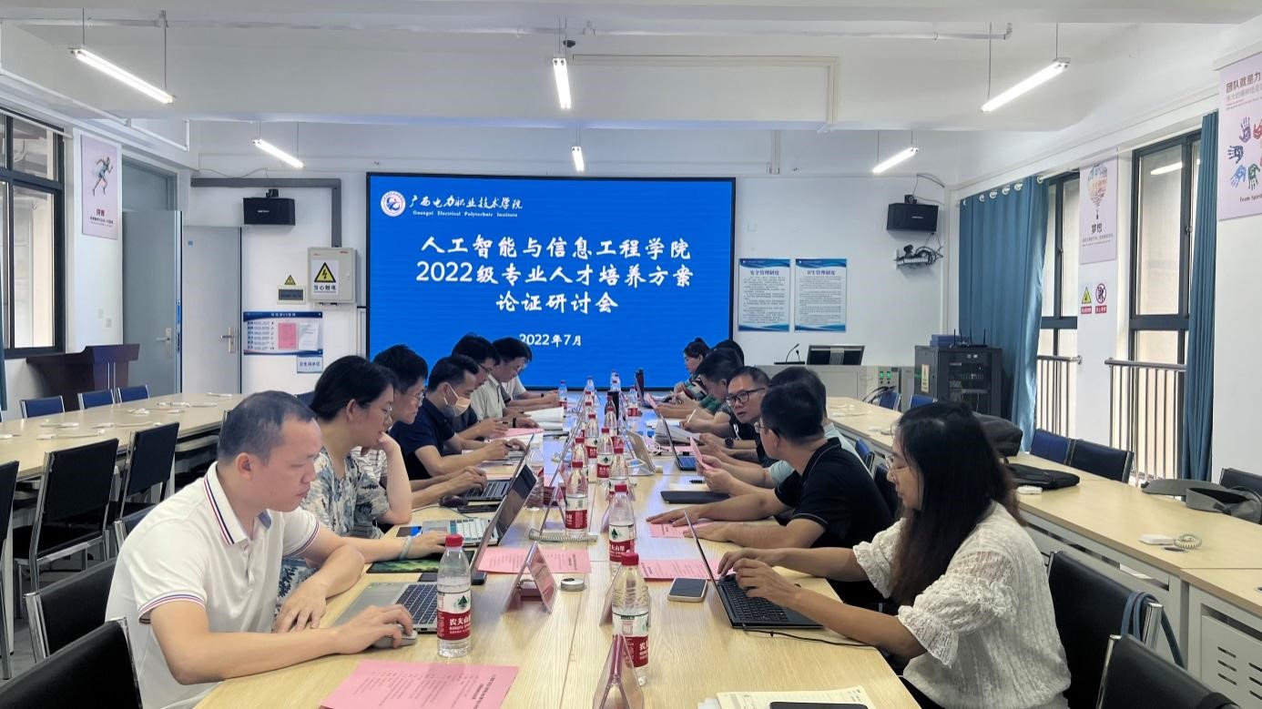 为落实党和国家教育方针,完善职业教育体系,优化学校专业建设布局,深化办学育人机制改革的常规工作,为进一步贯彻落实《国家职业教育改革实施方案》(国发〔2019〕4号)、《教育部关于职业院校专业人才培养方案制订与实施工作的指导意见》(教职成〔2019〕13号)、《教育部关于印发<加强碳达峰碳中和高等教育人才培养体系建设工作方案>的通知》(教高函〔2022〕3号)等文件的工作要求和精神,做好我院2022级各专业人才培养方案编制工作,2022年7月15日,在广西电力职业技术学院五象小区信息交通楼208室举行“人工智能与信息工程学院2022级专业人才培养方案论证研讨会”。