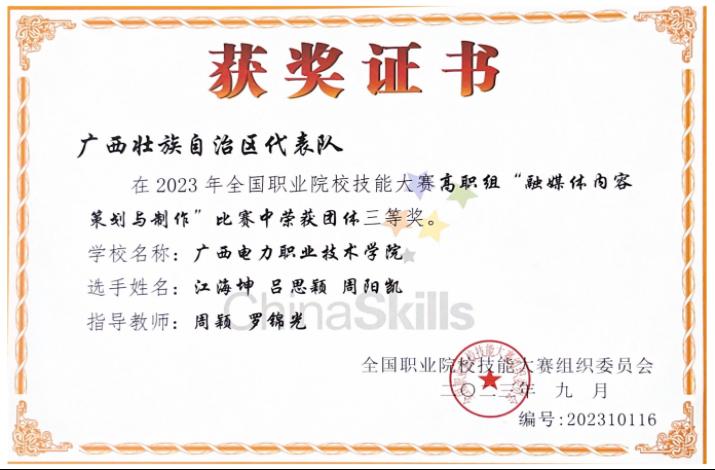 9月12-14日,2023年全国职业院校技能大赛(高职组)“融媒体内容策划与制作”赛项在北京电子科技职业学院成功举办,共有来自全国30个省、市、自治区的58支代表队174名选手同场竞技,经过6小时的激烈角逐,由我院计算机应用技术专业的吕思颖、周阳凯、江海坤3名学生组成的参赛队在本次大赛中荣获团体三等奖。