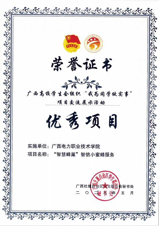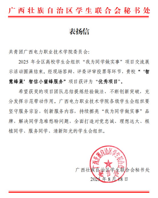 近日,从广西壮族自治区学生联合会传来振奋人心的好消息,我院“智慧蜂巢”智信小蜜蜂服务项目在广西高校学生会组织“我为同学做实事”项目交流展示活动中脱颖而出,成功斩获“优秀项目”荣誉称号。同时,广西壮族自治区学生联合会秘书处专门发来表扬信,对该项目的创新实践与服务成效给予高度认可和热烈祝贺。