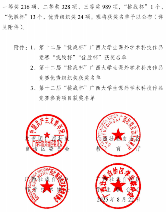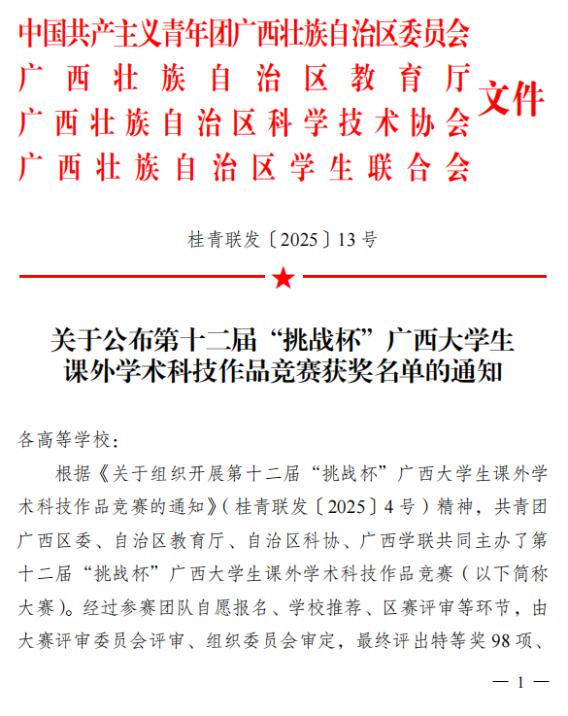 8月22日,第十二届“挑战杯”广西大学生课外学术科技作品竞赛落下帷幕,我院参赛项目喜获银奖。