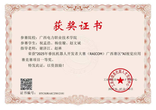 近日, 2025 年广西高校大学生学科专业竞赛—2025 年睿抗机器人开发者大赛 (AI 视觉应用创新赛)圆满落幕。我院选派的两支参赛队伍凭借扎实的专业功底、创新的技术方案与出色的现场表现,从全区众多参赛队伍中脱颖而出,喜获一等奖1项、二等奖1项。