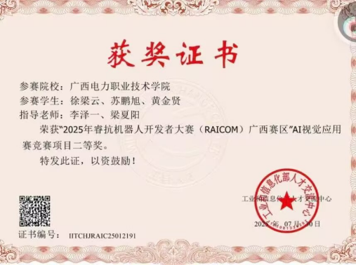 本次大赛聚焦 AI 视觉应用创新领域,旨在考察参赛选手对人工智能技术、机器视觉算法的综合运用能力及解决实际问题的创新思维,是区内高校在人工智能与机器人领域极具影响力的学科竞赛之一。2025 年 7 月赛事举办期间,我院两支参赛队伍顶住竞争压力,沉着应对赛程挑战。其中,由祝孟浩、杨佳璇、赵文斌三位同学组成的队伍,在作品设计中充分融合 AI 视觉识别、智能分析等核心技术,方案兼具实用性与创新性,现场答辩逻辑清晰、表现亮眼,最终斩获一等奖;徐梁云、苏鹏旭、黄金贤三位同学组成的队伍则凭借严谨的技术实现、完善的功能落地,展现出扎实的专业基础与团队协作能力,成功夺得二等奖。