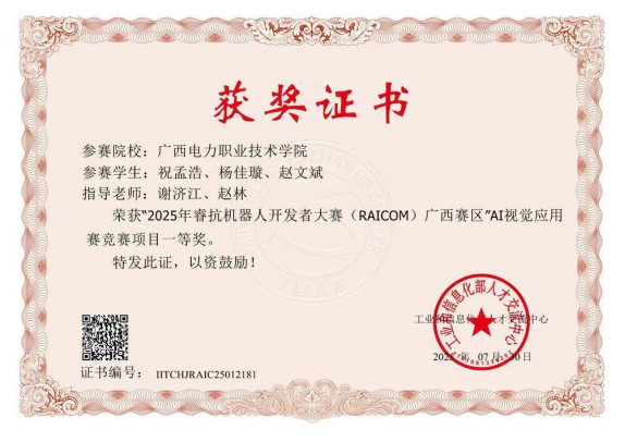 6月7日, 2025 年广西高校大学生学科专业竞赛—2025 年睿抗机器人开发者大赛(AI 视觉应用创新赛)圆满落幕。我院选派的两支参赛队伍凭借扎实的专业功底、创新的技术方案与出色的现场表现,从全区众多参赛队伍中脱颖而出,分获一等奖和二等奖。